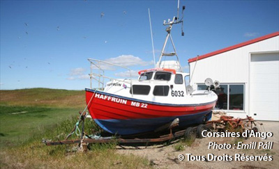 Un navire rouge et blanc est amarré. Pointant du doigt l’embarcation, Svanur indique que c’est son bateau (Haffrúin - Épouse de l'océan) qui emmènera les plongeurs sur la zone de l’épave du Pourquoi-pas ? située à quelques milles de là. Il indique également à René où il aura la possibilité de mettre son voilier après sa traversée de l'Atlantique Nord.