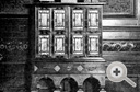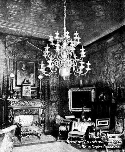 Des peintures sombres et des vitraux aux personnages hiératiques ou d'armoiries ornent les pièces aux murs tendus de tapisseries aux tons vieillis ou habillés de boiseries répétant des panneaux ou des colonnades aux feuillages entrelacés. Accrochés aux plafonds à caissons, des lustres en fer forgé profilent leurs arabesques réhaussés d'or discrètement lumineux. Les colonnes de bois sombre, les tapis d'Orient et les meubles en bois sculptés de style Renaissance ou Louis XIII, donnent aux pièces de réception une allure grave et somptueuse.