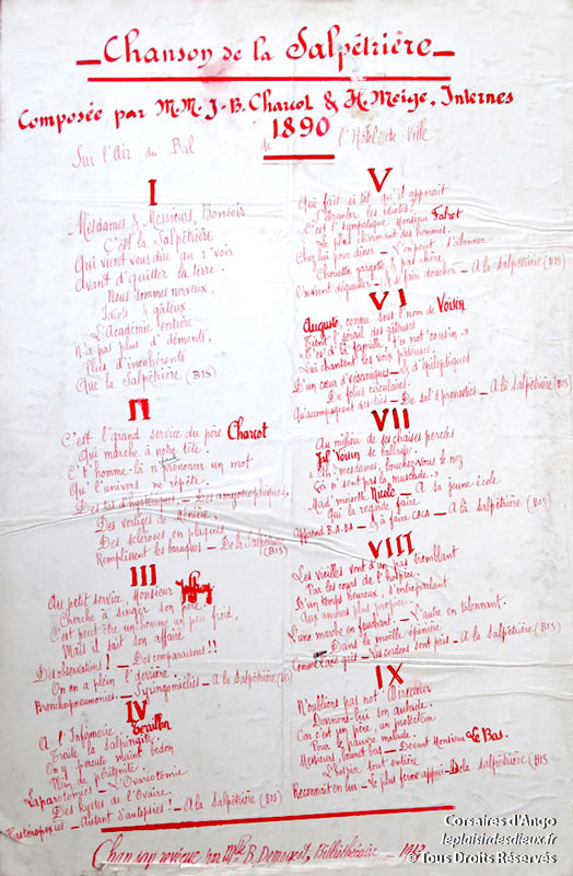 Le 19 mars 1891, Jean Martin est invité par son fils à un dîner en Salle de Garde de la Salpêtrière. Le dîner, au cours duquel on lui sert un gigot aux lentilles et on lui chante la comique chanson de la Salpêtrière, est si gai et si bruyant que le directeur de l'hôpital intervient pour faire interrompre le repas. Il est reçu par le Professeur Charcot un verre de champagne à la main ! Depuis lors, la Salle de Garde de la Salpêtrière s'appelle toujours "La Charcoterie".
