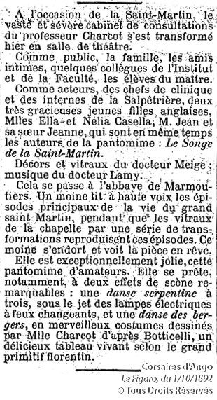 Après un dîner, la représentation est donnée dans le grand cabinet avec ses galeries latérales, où se pressent les spectateurs qui n'ont pas trouver de place ailleurs. Sur la scène dressée au fond de la pièce, on joue de du Molière ou du Shakespeare avec Jean-Baptiste en Jules César ou Jeanne en Macbeth avec les sœurs Casella en sorcières, ou une revue composée par les enfants Charcot qui donnent libre cours à leur fantaisie, pour le plus grand plaisir du Patron et des invités de marque. Le triomphe fut la légende de Saint-Martin, composée en l'honneur du Patron. Les vitraux, les costumes moyenâgeux, tout est l'œuvre de la troupe.
