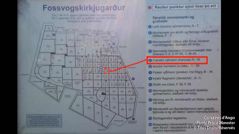 Les corps sont inhumés à mesure au cimetière de Fossvogur dans la banlieue de Reykjavík. Ce cimetière qui remplace celui de Suðurgata en centre-ville, devenu trop petit dès 1932, est un véritable havre de paix. En pente, tout en gazon et arbustes il accueille les marins français dans un carré réservé (Franskir Sjómenn - section B18)