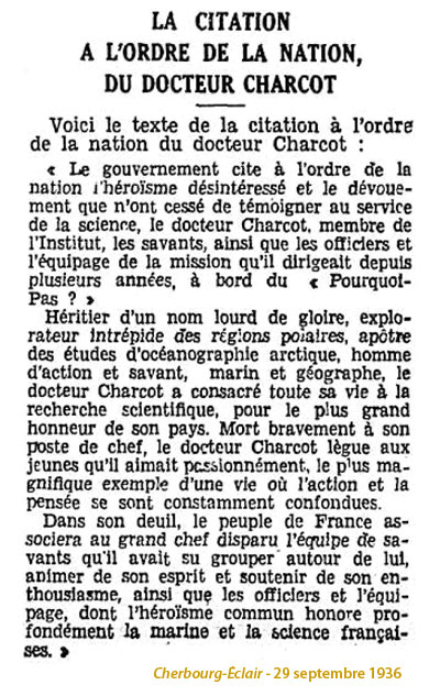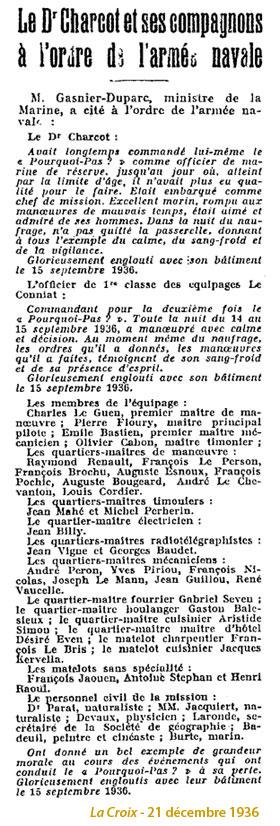 Par décision ministérielle du 9 décembre 1936, le gouvernement cite à l'Ordre de l'Armée navale, le docteur Charcot, l'officier de 1ère classe des Équipages Le Conniat, les membres de l'équipage, le personnel civil de la mission.