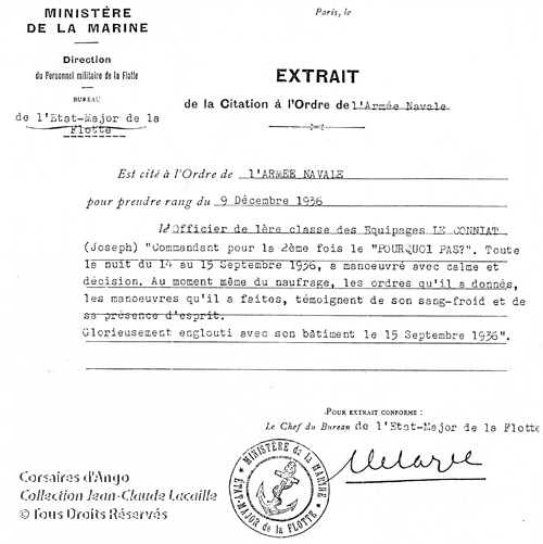 À l'issue de son rapport officiel sur les circonstances du naufrage, le vice-amiral Durand-Viel propose de citer à l'ordre du jour le capitaine de frégate de réserve Charcot, l'officier des équipages Le Conniat, tout l'équipage et les passagers du Pourquoi-pas ?, pour le bel exemple de grandeur morale qu'ils ont donné au cours des évènements qui ont conduit le Pourquoi-pas ? à sa perte.