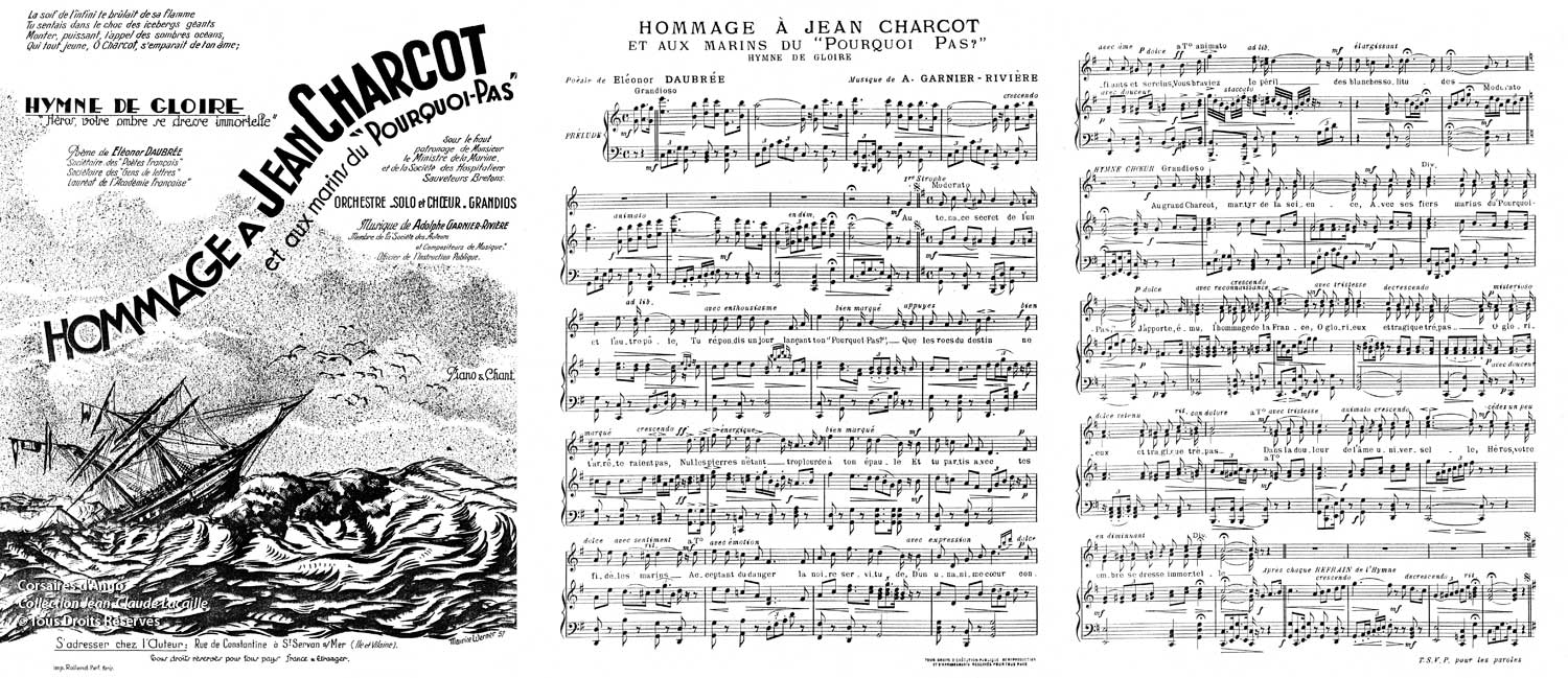 J’étais alors jeune parmi cet équipage, C’est en mille neuf cent trente, que pour la première fois, Ce trois-mâts de Charcot, armé par la Marine, Dans le fracas des mâts, brisés par la tempête, Et le vaillant bateau, secoué, épuisé, |